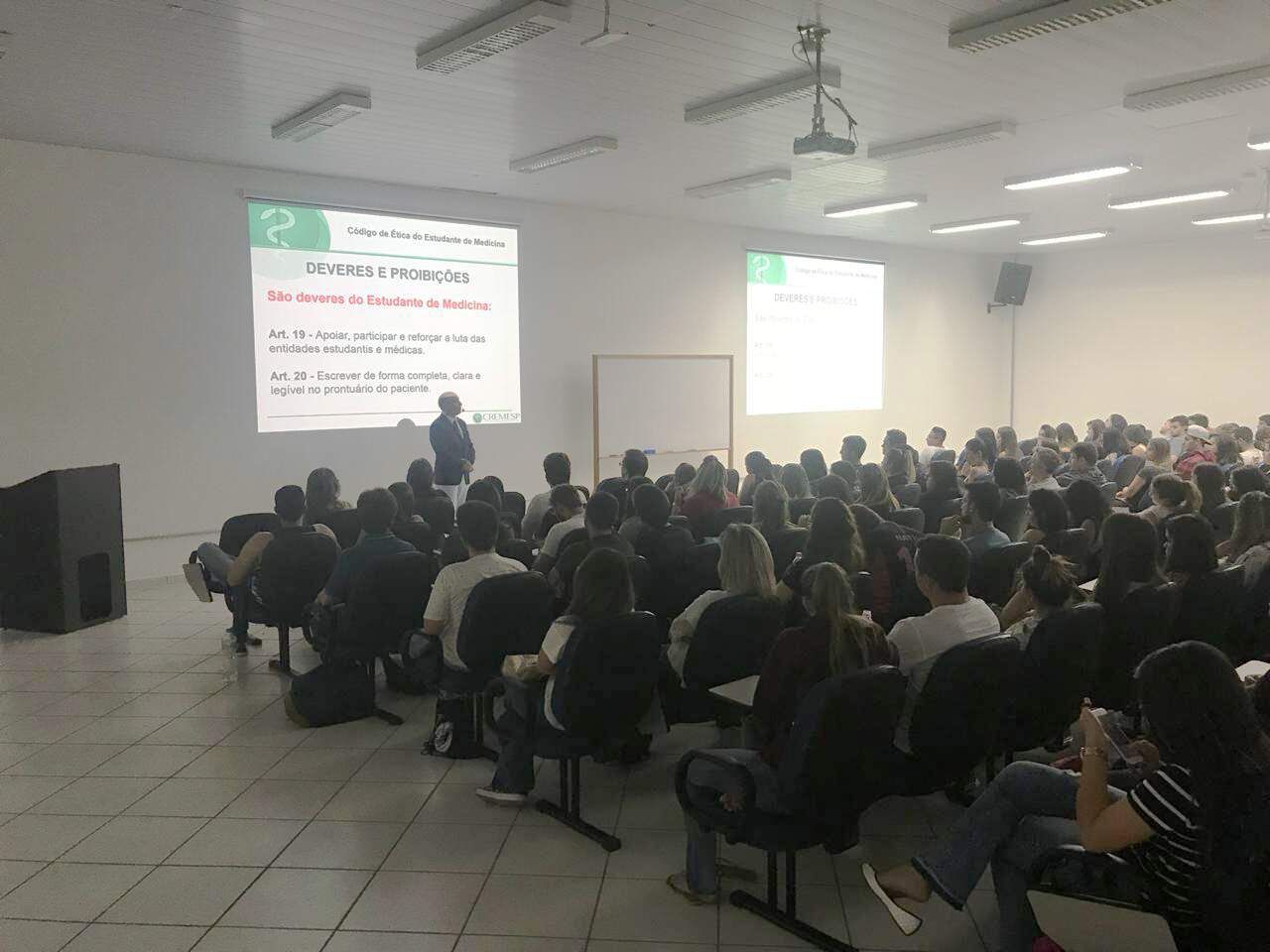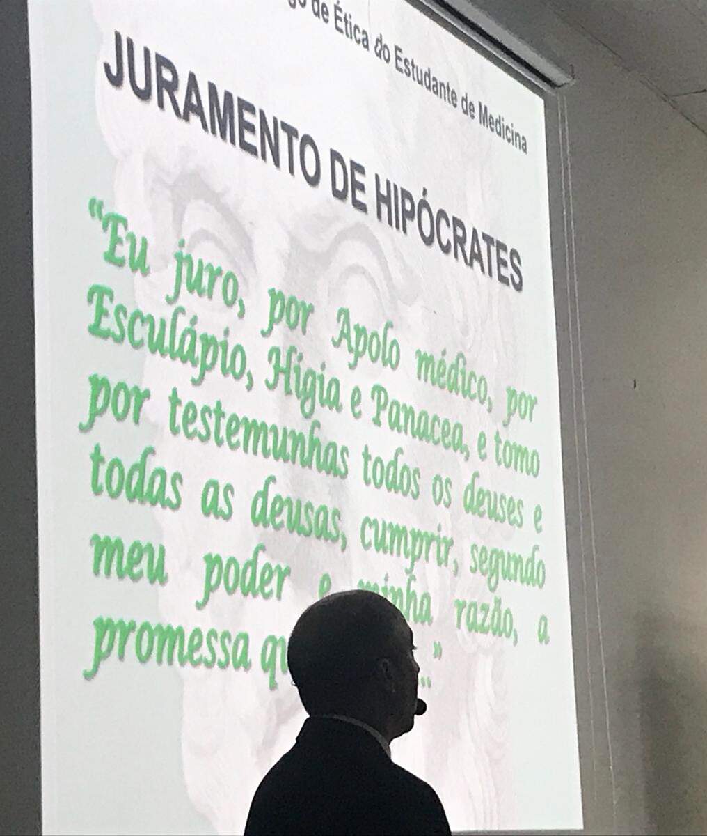 A solenidade foi aberta pelo Diretor Adjunto de Graduação da Faculdade, Dr. Fábio D’ Alexandri. Em seguida, falou o conselheiro do CREMESP, Dr. Rodrigo Souto de Carvalho, que apresentou o Código de Ética aos alunos, orientando-os sobre a conduta ética de um estudante de Medicina, e as normas que devem ser seguidas durante todo o período de graduação.